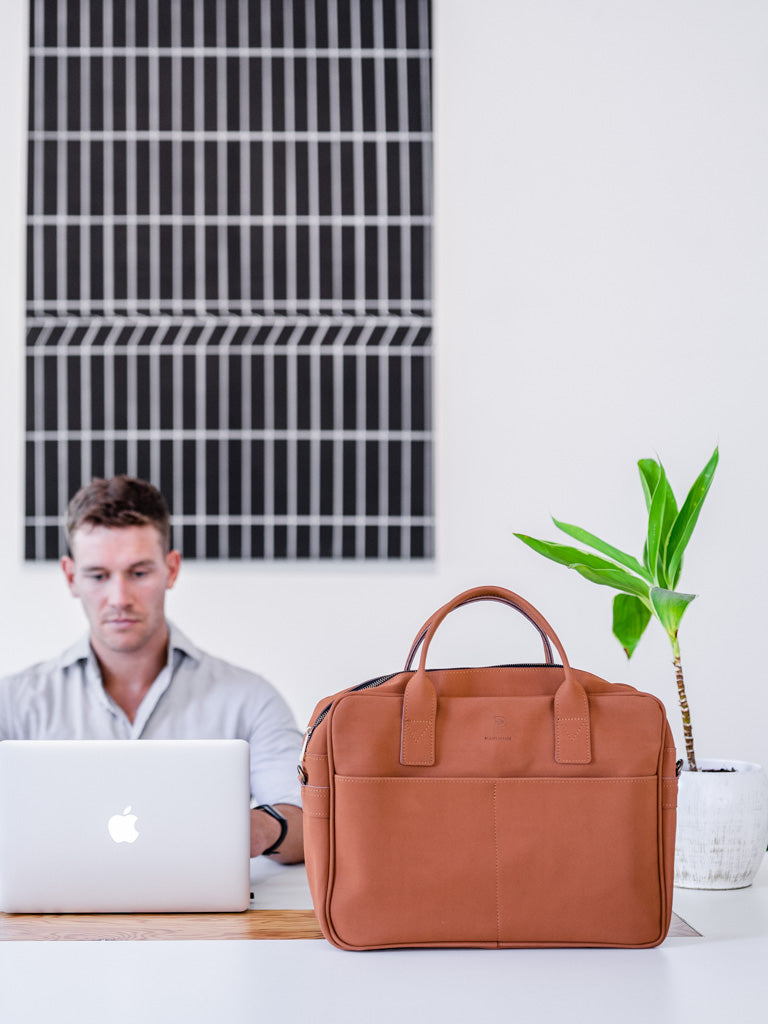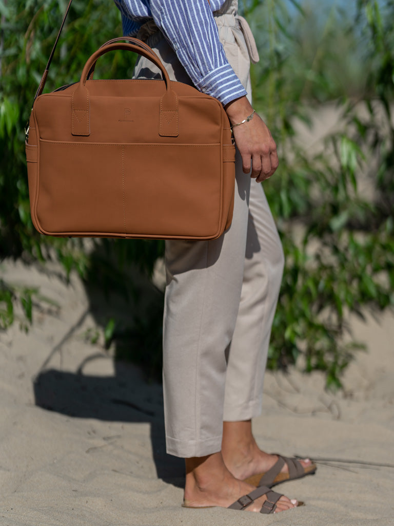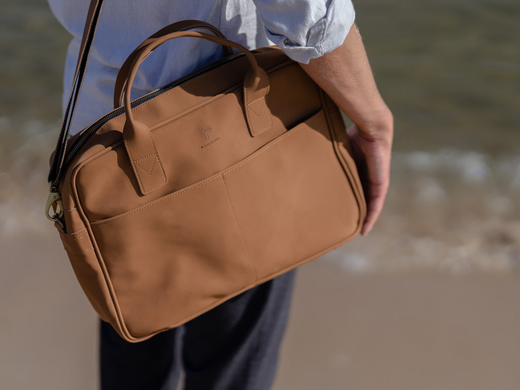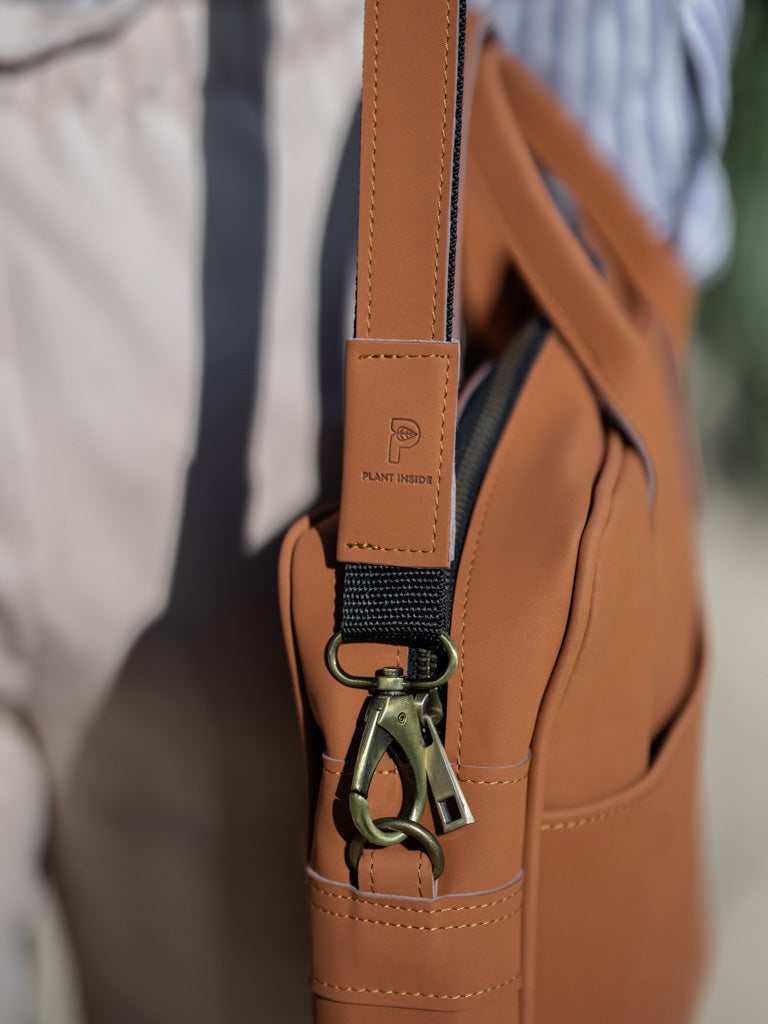 Ein durchdachtes Design für alle, die Stil, Funktion und Verantwortung miteinander verbinden möchten. Diese handgefertigte Laptoptasche aus PETA-zertifiziertem, pflanzenbasiertem Leder in Nubuk-Camel vereint minimalistisches Design mit robuster Verarbeitung. Hergestellt zu 100 % in der EU – vom Material bis zur letzten Naht.
